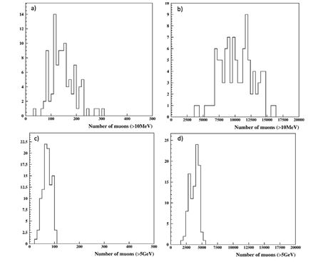 Figure 4: The Distribution of Muons from High and Low-Energy Primary Protons at Sea Level (a and b) and underground (c and d).