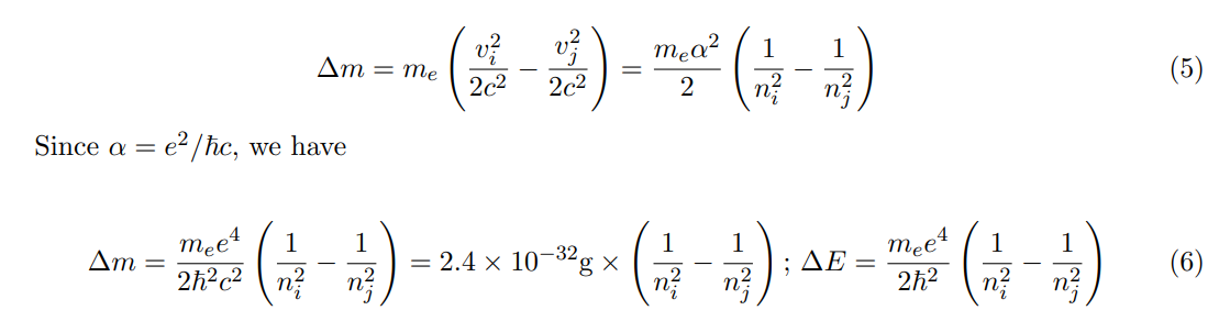 Taking into account δ = v2/c2 = α2/n2, being α the Sommerfeld constant, and as this relationship expresses the relativistic quantum ratio in electromagnetic emission (or absorption), we can insert it in (1) and (4)