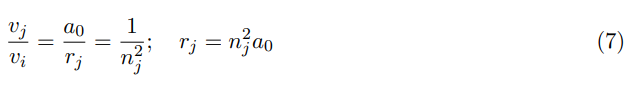 Likewise, according to Bohr’s formalism, the electron “velocity” is vi for ni = 1 and ri = a0 (Bohr radius). When the atom is excited or “expands”, v decreases inversely and linearly in terms of the Bohr’s radius: v = h(mena0).
