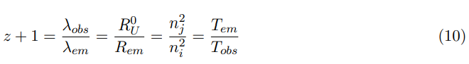For a transition ni = 1 to nj = 2, the atomic radius is 4 times greater, λobs for n = 2 is 4 times larger too. If z = 3, it means that the Universe was 4 times smaller Rem = R0 /4, or what is the same, the wavelength emitted was a quarter of the observed λem = λobs/4.