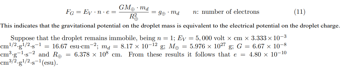 This equation is an illustrative expression in the most simplified form of the experiment. As the mass of electrons in our terrestrial contour is irrelevant, the experimental stratagem was to bond the units of charges to a heavy body. By removing the application of the Stokes’ Law and using only the correction for the atmosphere bouyancy, the result is equivalent to the mass of a motionless droplet in the vacuum. Since the intensity of the electrical field EV exerted on the droplet is independent of its position, consequently this approach is depending solely on their effective mass.