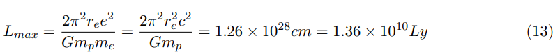 The “classical electron radius” re, physically has an entirely relativistic signification of equivalence between mass, radial distance and the unit of charge. This constant re, is the radial separation between two electrical charges when the Coulombic potential of energy is equivalent to the electron relativistic mass m c2 = e2/r . The gravitational interaction between a proton and an electron in the domain of re is FG e = Gmp me /(2π2r2). As in this conditions Fcoul = e2/r2 = me c2/r we can substitute it in the Eq. (12) and resolve for L max.
