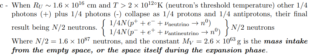 d- Finally, this N/2 neutrons coalesces to give ∼ 1.2 × 1068 Planck’s “particles” when RU = 6.4 × 10−11 cm and T = 1.62 × 1032 ºK.