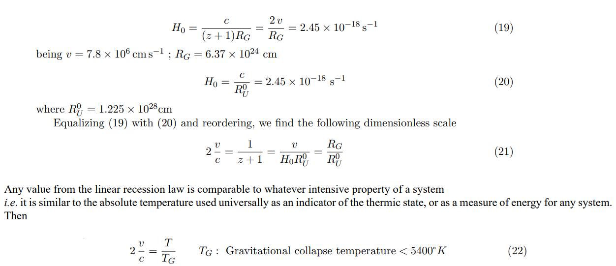 Despite of the different methods for the determination of the Hubble constant, and the implications of the Universe age, for us, H−1 as well as t0 , are not independent quantities, since we consider for H a clear point of arribal. Thus RG = 2.060 Mps (6.40 × 10≈cm) 0 0 G referential point, is coincident with the withdrawal of the protogalaxies after gravitational collapses (Sect. 4.2).