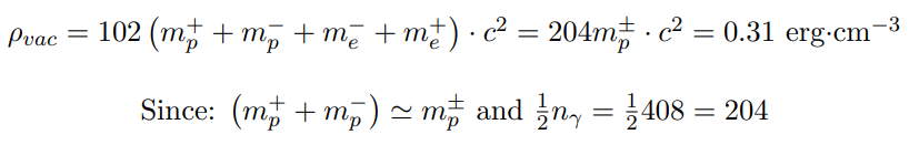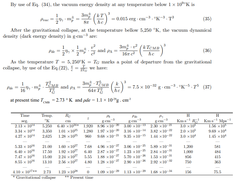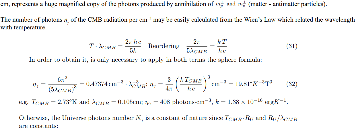 b- For the electron’s threshold temperature T ∼ 6 × 109ºK and RU ∼ 2.6 × 1019 cm, 1/4 photons (-) and 1/4 photons (+) collapses as 1/4 electrons and 1/4 positrons.