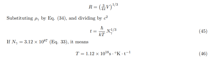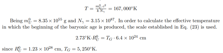 When the Universe radius was 6.37 × 1024cm = 2.064 Mps = RG with a Planck’s blackbody distribution curve corresponding to a temperature of ∼ 5, 250ºK, there still existed a fraction of photons in a thermic state equivalent to ∼ 166, 000ºK, whose number was the same as the whole population of baryons (Sect. 5.3).