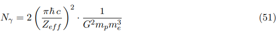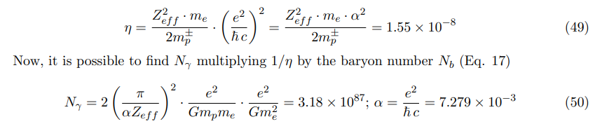 From this equation, it is clear that the photons number Nγ of the CMB radiation is a result of the ratio in the Coulombic interaction between the electron-proton and the electron-electron, with respect to the gravitational interaction of its masses. This ratio, is invariant from any quantum state and the number of interactive particles. It should be noted, that Nγ is deduced entirely from physical constants, which are not subject to any direct cosmological observation. The same equation (50) can be expressed in a mathematically simpler way:
