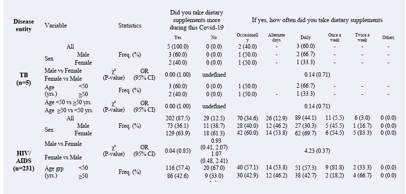 Objectives: To evaluate the dynamics of dietary and herbal supplements intake by persons already diagnosed with Tuberculosis (TB), Human Immuno-deficient Virus (HIV) and Hepatitis (Hep) during the pandemic in Nigeria.