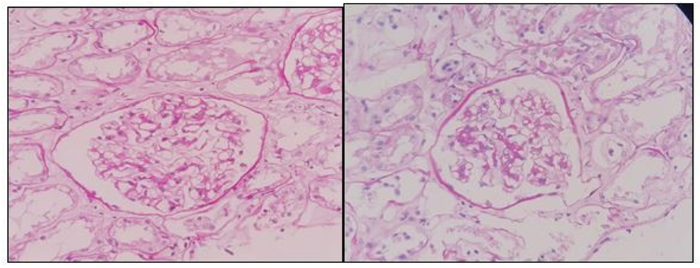 PICTURES 1a-1b: Periodic Acid-Schiff 200X. Glomerulus without significant histological alterations.