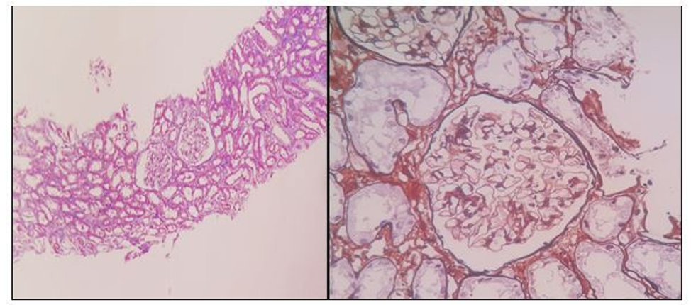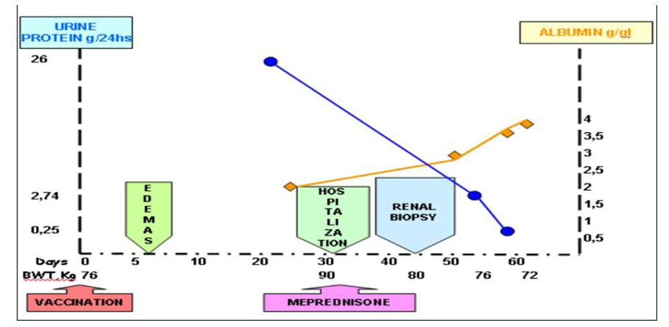 75 year-old patient, male, without pathological antecedents or fre- quent medication use who on July 20 2021 received his second dose of Sputnik V. 24 hours later, he develops a macular erythema-tosus pruritic rash with predominance in his superior and inferior limbs. 4-5 days after the resolving of the skin manifestation, he de¬velops a facial swelling and an increase in the diameter of the su¬perior and inferior limbs. He sees his GP who runs some tests that yield the following: proteinuria 26g/24hs, albumin 2.2mg, urea 62 mg/dl, creatinine 1.2mg/dl, cholesterol 339 mg/dl, hematocrit 48.4 4%, sodium 113. A medical treatment against the nephrotic syn¬drome (loop diuretics and potassium-sparing diuretics) is started, without clinical response. Therefore, the patient is hospitalized for further tests and treatment. When he is admitted, the swelling of limbs is confirmed, together with scrotum and eyelid swelling, ar¬terial hypertension (TA169/90) and an overweight of 14 kg (90 kg, when his usual weight is 76 kg). We carry out a urine sediment analysis which yields: SA: ++++ blood-, OM: Oval fat bodies, cy¬lindrical structure without microhematuria. Renal sonogram with Doppler ultrasound: normal findings. Tests were expanded (table 1). The obtained results show, through electrophoretic proteino¬gram, hypogammaglobulinemia and hypotiroidism with values slightly out of range, which were interpreted to derive from the course of the nephrotic syndrome. The rest of the carried out deter-minations did not show positive results. The patient is prescribed a strict hyposodic and hypotroeic diet, water restriction, a treatment with furosemide 240 mg/day EV associated to albumin to 20% (4 flasks=40g/day), atorvastatin 20 mg/day, enalapril 10mg/day and amiloride 5mg/day. He starts taking meprednisone at a ratio of 1mg/kg per day during six weeks.