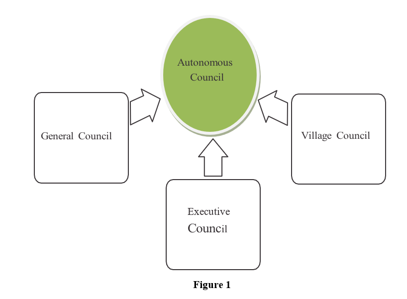 Autonomous Councils are structured with a General Council, an Executive Council, and Village Councils. The General Council, with a 5-year term, consists of 40 members: 36 elected by residents and 4 nominated by the government. It holds executive powers over various subjects in the council area.