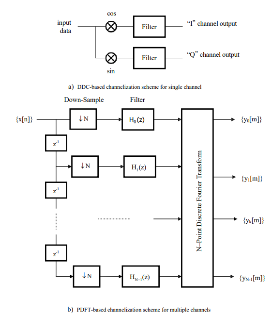 The traditional approach to wideband signal channelization has been to use a bank of digital down conversion (DDC) units, with each channel being produced individually via a DDC unit which digitally down-converts the signal to base-band, constrains the bandwidth with a digital filter, and then reduces the sampling rate by an amount commensurate with the reduction in bandwidth [1]. This approach is costly, however, in that multiple channels are produced via replication of the DDC unit, so that there is no commonality of processing and therefore no possibility of computational savings being made. This is particularly relevant when the number of channels is large, as each DDC unit typically requires one/two finite impulse response (FIR) low pass filters for real-valued/complex-valued data and one stored period of a complex sinusoid sampled at the input sampling frequency [2,3].