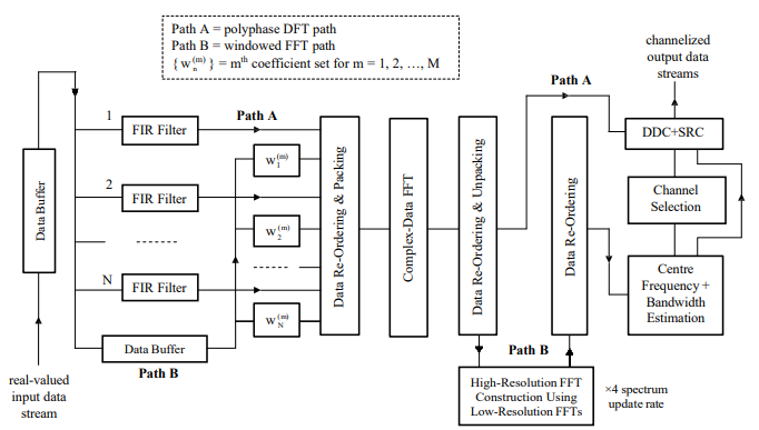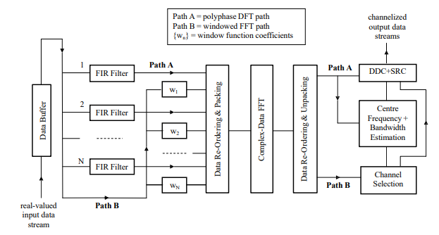 Another key feature of the proposed design, as described in Fig. 3, is that if a complex-data FFT module is used for the processing of the polyphase filtered data, then it may also be used for the processing of the windowed input data – given that both types of data are assumed to be real-valued – which may subsequently be used by the SPE module. The two data sets may be processed simultaneously through the suitable packing/unpacking of the FFT input/output complex-valued data array, with the PDFT path being referred to in Fig. 3 as ‘Path A’ and the windowed FFT path as ‘Path B’. The ‘Path B’ data, after unpacking, is thus fed to the SPE module which typically carries out averaging, thresholding and interpolation of the squared amplitudes of the spectrum to determine the addresses of those channels that contain the signals of interest [6]. For those particular channels, the unpacked ‘Path A’ data is then passed to the SPE module and a parameter estimation routine executed which involves the channelized data being spectrum analysed to yield estimates of the centre frequency and bandwidth of those signals residing within the channels. This enables the DDC units to be used for optimally extracting the signals of interest from the targeted channels and SRC units to be used, if required, to adjust the output sampling rate from the DDC units to satisfy any future processing requirements.
