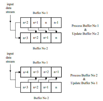 The technique of double buffering will need to be utilized in several places to ensure that pipelined operation of the channelization scheme is achieved. The basic idea is that whilst one buffer is being updated with new data, the data from the other is being processed by the appropriate processing elements (PEs). When the buffer is completely refreshed each time with new data this is quite a straightforward task. When overlapping of the data is involved, however, a more complex scheme is required. To achieve this, new data and data from the buffer being processed are fed simultaneously into the buffer being updated and the operation of the two buffers alternated with the availability of each new set of data – see Fig. 6 for the case of the complex-data FFT.