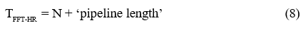 The short M-point FFTs required for the construction of the high-resolution FFT may be carried out in optimal fashion via one of Winograd’s short-DFT algorithms (which are, in turn, based upon the use of optimal fast circular convolution algorithms), with additional savings being potentially obtained by computing only those outputs that correspond to the non- negative frequency components of the required composite length transform [8]. The structure of the optimal short-DFT algorithms – which may each be expressed in the form of a set of pre-weave additions, followed by a set of nested point-wise multiplications, followed by a set of post-weave additions – lends itself naturally to a pipelined implementation.