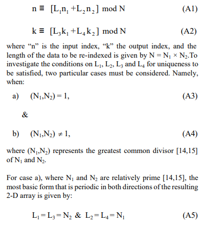 The mapping of one-dimensional (1-D) arrays into multi- dimensional (m-D) arrays provides the basis for most of the existing FFT algorithms. These mappings need to be both unique and cyclic in every dimension [13] to ensure that: 1) the original DFT can be recovered in its correct form; and 2) the correct periodicities are obtained for each of the small DFTs that constitute the m-D form. Mappings will now be briefly described for the conversion of a 1-D DFT to a separable 2-D DFT, as this is the formulation of interest in this paper.