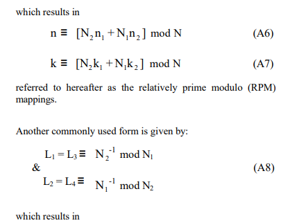 Then by applying the RPM mapping of Eqtn. A6 and the CRT mapping of Eqtn. A10 to the input and output data sequences, respectively, the DFT can be written as: