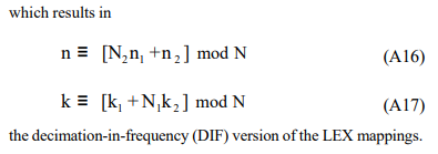 where N1 and N2 are arbitrary factors, with or without common factors. Then a sufficient pair of mappings, for the 1-D to 2-D transformation, may be given by the DIF version of the LEX mappings (as described by Eqtns. A16 and A17), enabling the DFT to be written as: