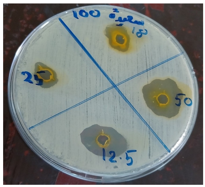 The agar well diffusion method is widely used to evaluate the antimicrobial activity of plants or microbial extracts [10]. It requires careful observation and attention to detail. Using a sterile wire loop, touch 3–5 well-isolated colonies of similar appearance to the test organism and emulsify in 3–4 ml of sterile physiological saline or nutrient broth. In an excellent light, match the suspension's turbidity to the turbidity standard (mix the standard immediately before use). When comparing turbidities, viewing against a printed card or sheet of paper is more accessible. Using a sterile swab, inoculate a plate of Mueller Hinton agar. Remove excess fluid by pressing and rotating the swab against the side of the tube above the level of the suspension. Streak the swab evenly over the surface of the medium in three directions, rotating the plate at approximately 60 to ensure even distribution. With the petri dish lid in place, allow 3–5 minutes for the surface of the agar to dry. Then, a hole 6 to 8 mm in diameter is punched aseptically with a sterile cork borer. Turmeric was diluted into different concentrations: 100%, 50%, 25%, and 12.5% against the selected organisms [10]. Then, agar plates are incubated under suitable conditions. Using a ruler on the underside of the plate, measure the diameter of each zone of inhibition in mm. The endpoint of inhibition was where growth started [11].