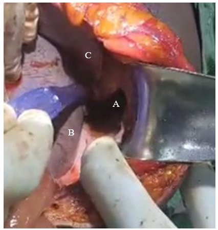 Figure 1: Intraoperative Findings; A) Diaphragmatic Laceration, B) Spleen and C) Liver