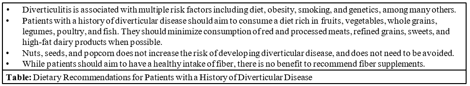 After experiencing an initial bout of diverticulitis, one in four patients subsequently develop recurrent disease [26]. Indications for surgery would include peritonitis, abscess, fistula, stricture, or lifestyle limiting disease, which is a highly individualized patient decision. While patients were previously advised to avoid many fiber rich foods, symptoms associated with intake of nuts, seeds, or corn would more accurately be categorized as lifestyle limiting disease, as refractory diverticulitis is more likely causing the intolerance of certain foods rather than these foods triggering a flare of diverticulitis. Current recommendations support counseling patients on the importance of a diet rich in fruits, vegetables, whole grains, legumes, poultry, and fish, while limiting the intake of red and processed meats, refined grains, sweetened foods, French fries, and high-fat dairy products.
