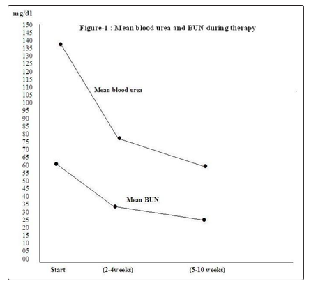 After 2-4 weeks of therapy, the mean blood urea level was reduced from 137.45 mg/dl (Mean BUN 61 mg/dl) before the start of therapy to 78.5 mg/dl (Mean BUN 34.5 mg/dl). Within 5-10 weeks of therapy, mean blood urea level was 60 mg/dl (Mean BUN 25.7 mg/dl). Figure-1 shows the mean blood urea and BUN during the period of therapy.