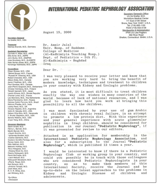 Ira Greifer also wrote “I was most fascinated by your use of gum Arabic in children with chronic renal failure, in attempt to promote low protein diet. With this experience and your general experience with acute glomerular nephritis in Iraqi children, should be considered for publication in our journal “Pediatric Nephrology”, if it was presented for review to our editors.”