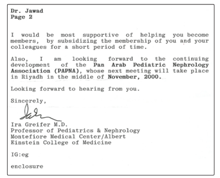 It was not long time when Al-Mosawi received a reply from Ira Griefer. He wrote “ I was very pleased to receive your letter and know that you are working very hard to bring the benefit of modern knowledge, techniques and treatment to children in your country with Kidney and Urologic problems.” Figures 3A and B show the 2-page letter of Ira Greifer.