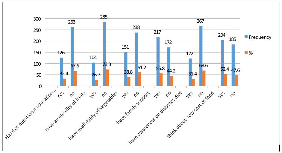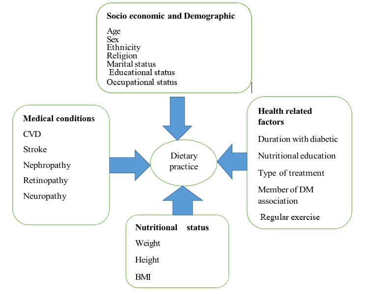 Socio demographic characteristics (age, sex, marital status, monthly income, Educational status, Family support, Occupational status,), Nutritional status (weight in kg, height in meter, BMI) Medical conditions: HPN, CVD, Stroke, Amputation, Nephropathy, Retinopathy. Health related factors: Duration Diabetic, Nutritional education, type of treatment, member of DM association, Regular exercise, Nutritional knowledge, and FBS Level.