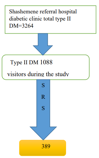 In Shashemene referral follow-up clinic there are 3,264 registered diabetic patients under follow up care. Every patient had follow- up at list every 3 month. Systematic sampling technique was used to select the study participants. The K-value (the interval) was calculated by dividing total number of type II DM patients (1088) who have appointment during the study period from diabetes referral clinic registration log book to the calculate sample size. Accordingly, every 3 patients were selected, with the first sample chosen by lottery method (Figure 2). K is calculated as K =N/n , 3264÷ Q3month follow up =1088 monthly follow up 1088÷389 =2.7(3).