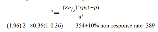 d = margin of error(d)5% by adding 10% none response rate then the final sample size was 389 type II DM patients.