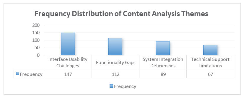 Acontent analysis of students’ responses revealed four main themes regarding their experiences with digital learning platforms (see Table 1). The most commonly cited concern, with 147 mentions, was related to interface usability challenges, indicating that many students struggle with navigation, accessibility, and overall user-friendliness. The need for features that facilitate interactive and collaborative learning was highlighted by the presence of Functionality Gaps, which received 112 mentions. Issues related to the fragmentation of tools, where multiple programs are required for a single course without seamless interoperability, were noted as System Integration Deficiencies, mentioned 89 times. Finally, Technical Support Limitations, with 67 mentions, underscored the importance of having prompt and efficient support available.
