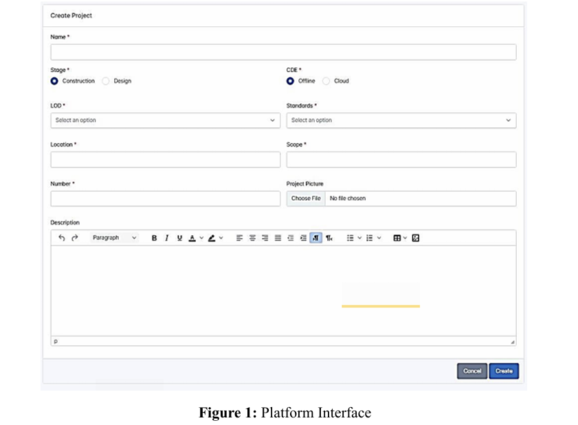 • Input Project Details: The first step involves entering basic project information, such as the project name, location, scope, LOD (Level of Detail), and project stage (Design or Construction). The user selects whether the project data will be managed on a cloud or offline (CDE).