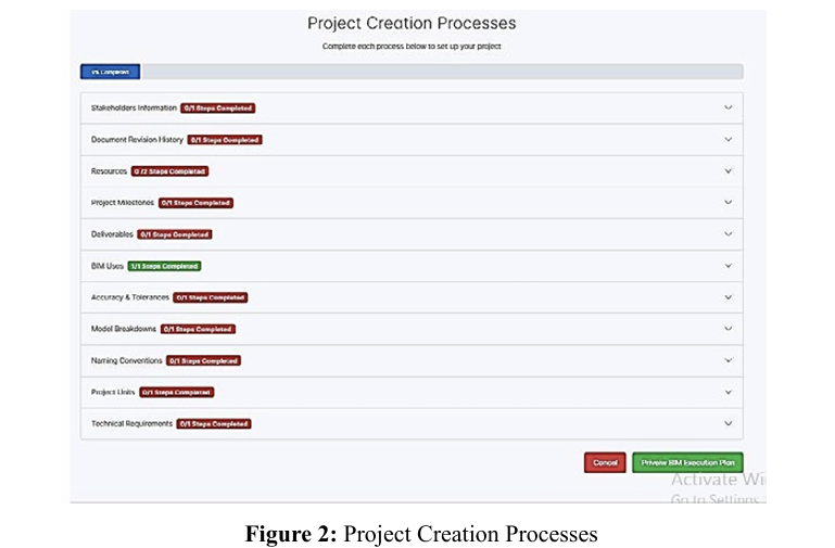 The literature review also explored previous research on the development and implementation of BEPs across various sectors in the construction industry. This included studies emphasizing the importance of standardized communication and governance frameworks to ensure consistency and collaboration across multidisciplinary teams. The review highlighted an existing gap in research regarding the practical application of digital platforms in BEP standardization, laying the foundation for the empirical analysis of the BIM Execution Plan platform.3.2 Platform Assessment The second stage of the methodology involved an in-depth assessment of the BIM Execution Plan platform in the context of its ability to support the standardization and automation of BEPs. This stage focused on evaluating key platform features such as: