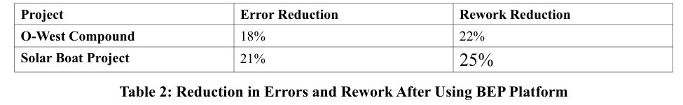 The automated checks embedded in the platform led to significant reductions in project errors and rework. In both case studies, errors were reduced by around 20%. Experts attributed this to the platform’s real-time collaboration tools and automated compliance features, ensuring all stakeholders had access to the latest project information. The Solar Boat Project benefited most, with a 25% reduction in rework attributed to fewer miscommunications.