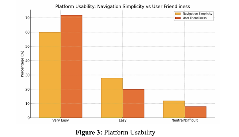 • Navigation Simplicity: 60% of participants reported that the platform was "Very Easy" to navigate, 28% found it "Easy," while only 12% found it "Neutral" or encountered minor difficulties, as shown in Figure 3.