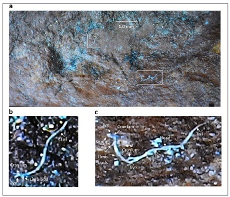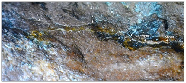 Figures 4a-4c: Found on imprint 2 of the trace fossil are three ~0.4-0.6 mm long squamates with saurian-like crania, the absence or near absence of limbs, elongated bodies, and tails, suggesting they were saurians transitioning into a more snake-like form (lizard to snake transformation)
