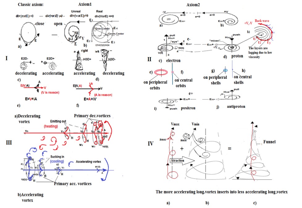 According new Axiom1: A field in which the vector E moves with a monotonically non-uniform speed (decelerating or accelerating) becomes an open vortex field structure: div (rot E) is not equal to zero (0), (Figure 1,Ib). [2-4]. Axiom 1 claims that there are 2 type open vortices - transverse (in plane 2D) (Figure 1,Ic) and longitudinal (in volume 3D) (Figure 1Id). Each of them can be accelerating or decelerating. Therefore we receive 4 type of open vortices.