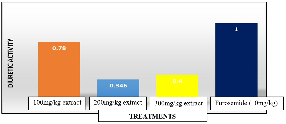 Furosemide showed the highest Diuretic action (11.45%) followed by 100 mg/kg extract (8.93%), 300 mg/kg (4.58%), 200 mg/kg (3.96%) indicating that the extract did not show a dose-dependent diuresis. The diuretic action of the plant extract at the lowest dose was high and quantitatively similar to that of Furosemide (Table 4). According to Gujral et al., diuretic activity is good if it is greater than 1.5, moderate if it is between 1.0 and 1.5, little if between 0.72 and 1.0 and nil if it is less than 0 [35]. Thus, 100 mg/kg aqueous extract showed little diuresis while 200 & 300mg/ kg extract showed very slight diuresis compared to Furosemide (Standard) (Figure 1).