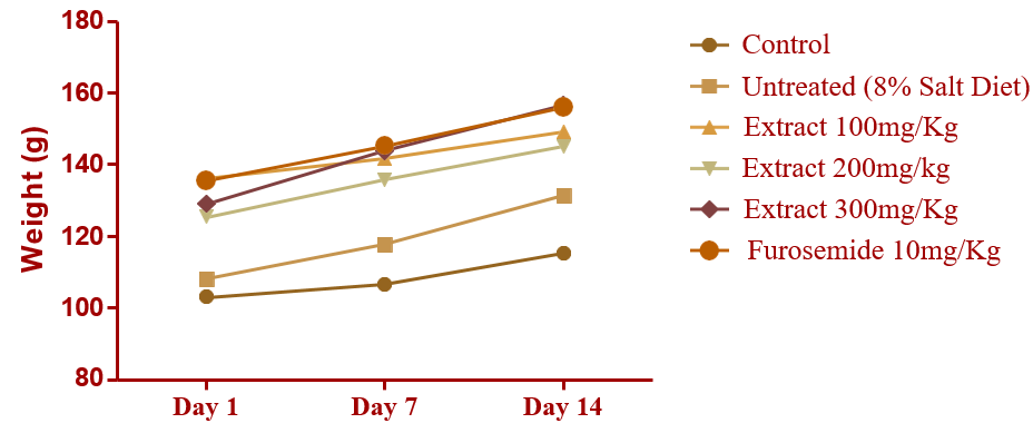 It was observed that the extract of C. chinense did show any sign of toxicity rather there was a steady increase in the weight of the rat (Figure 2) during the period of treatment without any observable change in skin & eyes etc. up to day 14 of the study. Unlike the rats in the high salt group, rats in the extract treated group were active and healthy in appearance reversing the weakness experienced by the rats before treatment thus showing a likely preventive effect of C. chinense.