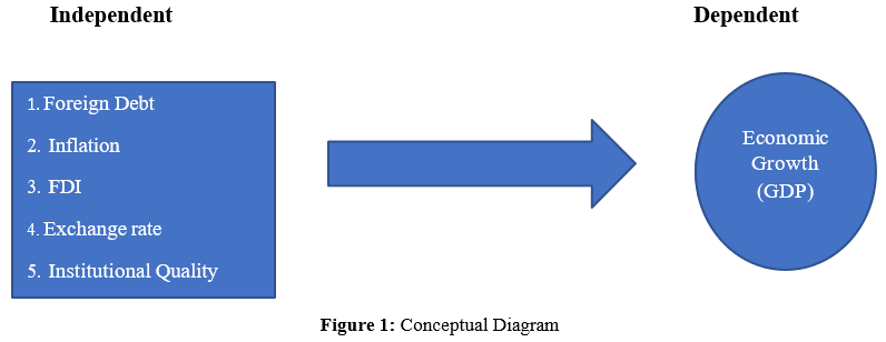 Economic Growth = f (Foreign Debt, Inflation, FDI, Exchange Rate, Institutional Quality) The conceptual framework assumes that economic growth in Tanzania is influenced by the level of foreign debt, the inflation rate, capital inflows such as FDI, exchange rate fluctuations, and the strength of institutional quality. A negative relationship is hypothesized between debt and growth, while FDI and strong institutions are expected to promote growth.