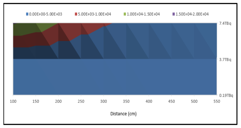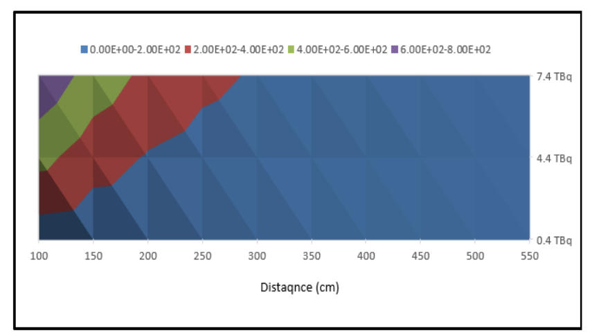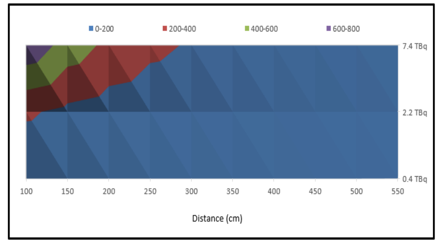 Figure 14: Dose Rate (mSv/h) due to 192Ir Point Source (0.2-7.4 TBq) in the Presence of 3.0 cm Pb Shield at Different Distances