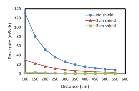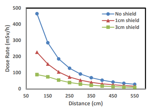 Figure 16: Dose Rate (mSv/h) due to 2.2 TBq of 60Co at Different Distances With and Without Shield