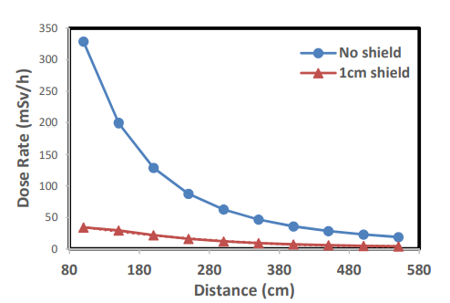 Figure 17: Dose Rate (mSv/h) due to 3.7 TBq of 192Ir at Different Distances With and Without 1.0 cm Pb Shield