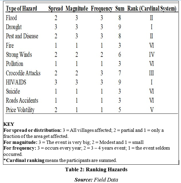 In attempt to understand the vulnerability of communities, it was imperative to examine the nature and characteristics of hazards that were prevalent in T/As Ngabu and Lundu. The study revealed that floods, drought, dry spells, strong winds, pest and diseases, HIV/AIDS, pollution, crocodile attacks, fire, suicide and road accidents and price volatility with varied frequency, spread and magnitude were common in T/As Ngabu and Lundu. TASAF (2010) and Rugumamu and Haule (2015) also conducted studies in Tanzania and found that drought, floods and dry spells with high frequency and magnitude affected communities in Tanzania [7,8]. Therefore, this study sought to rank the disasters in both T/ As Ngabu and Lundu in Chikwawa District in the Lower Shire Valley based on frequency, spread and magnitude.