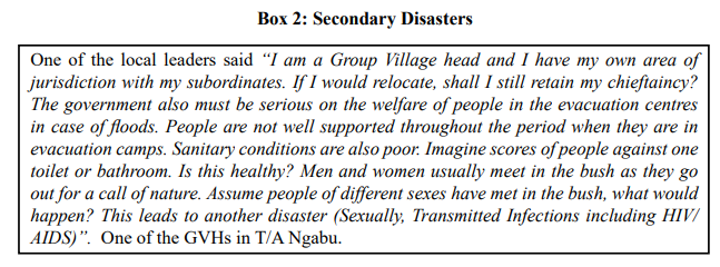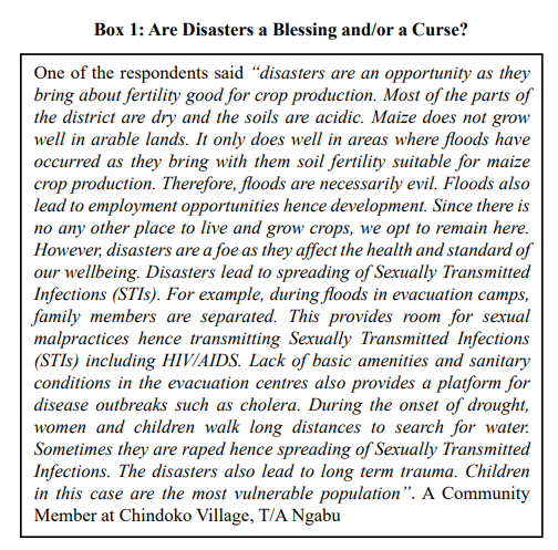 Qualitative and quantitative research methods were employed. Qualitative methods were used to elicit people’s perception and knowledge of risk and their adaptation responses to disasters. Participatory GIS was used to locate areas that are prone to floods, droughts, inundated areas, identify streams that jump their beds to cause floods, locate social services, areas for cultivation, areas for grazing animals and safer areas in cases of floods. Quantitative methods were used to assess the vulnerability of people, determine the development activities adversely affected by disasters and assess reasons why people still remained the disaster-prone areas. Sampling techniques and modification- detection techniques were employed to select local people and to identify shire valley environmental change.