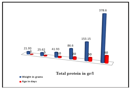 The concentration of total protein by the age of 20 days reached 29.2±0.2 g/l (control), slightly increasing by the age of 30 days to 29.5±0.5 g/l (experiment). By the age of 60 days, the total protein reached a maximum value of 38.4±0.6 g/l (control) and 38.9±0.8 g/l (experiment), remaining constant in subsequent age periods.