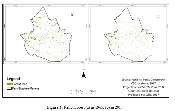 Land-use mapping for 1965 and 2017 (figure 2 (a) et 2 (b)) indicates a significant decline in gallery forest extent over 52 years, decreasing from 867.14 km² in 1965 to 659.18 km² in 2017. The proportional rate of decline is 23%, which does not meet the threshold for threat classification under Criterion A1. Accordingly, the gallery forest ecosystem is classified as Least Concern (LC) under Criterion A1.