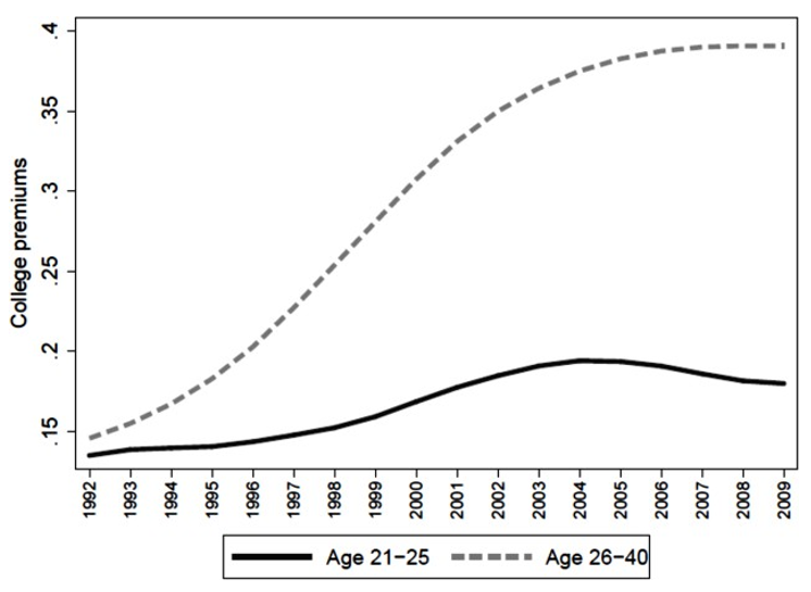 Figure 1: Displays the Disparity in College Premiums Between Inexperienced Workers (aged 21-25) and Experienced Workers (aged 26-40) in Urban China