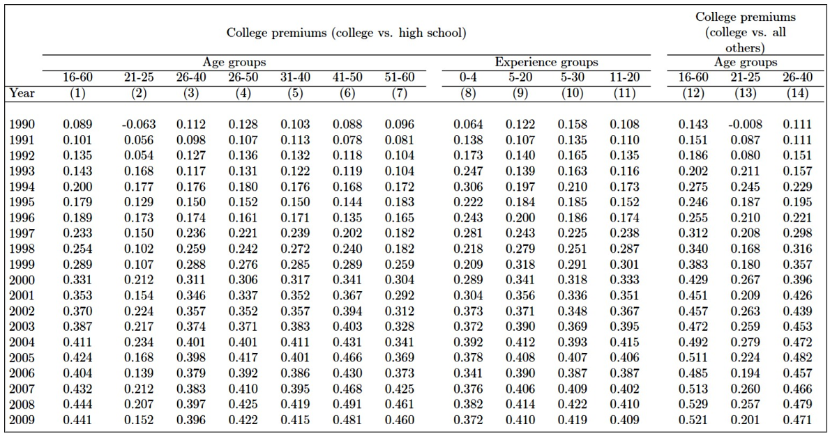 Notes: Cross-sectional regressions are employed to estimate the college premiums for each age group or experience group in each year. The independent variables considered in this analysis are a college dummy variable, gender, and provincial fixed effects. The sample of individuals with a minimum of a high school degree is utilised in columns 1-11. The variable representing the number of years of experience is defined as the disparity between the present year and the year in which the individual commenced their employment.